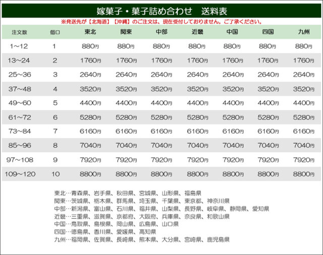 嫁菓子(1,080円)はご注文数量によって送料が異なる商品です。 1万円以上送料無料の商品と合せてご注文の場合でもこちらの商品については下記の表の通り送料が追加となります。 自動送信メールには送料の記載が「0円」となっている場合がございますが、ご注文確認メールにて送料を記載返信いたしますのでご確認くださいませ。